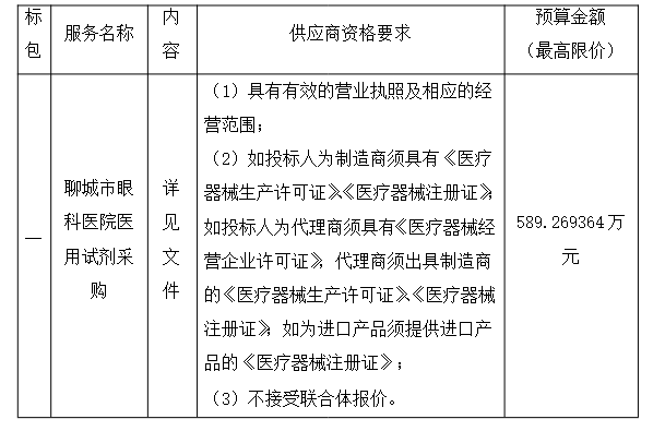 聊城市眼科医院医用试剂采购项目 招标公告