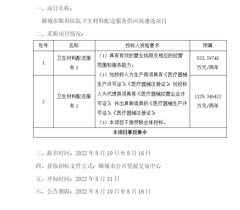 聊城市眼科医院卫生材料配送服务供应商遴选项目招标公告(二次)