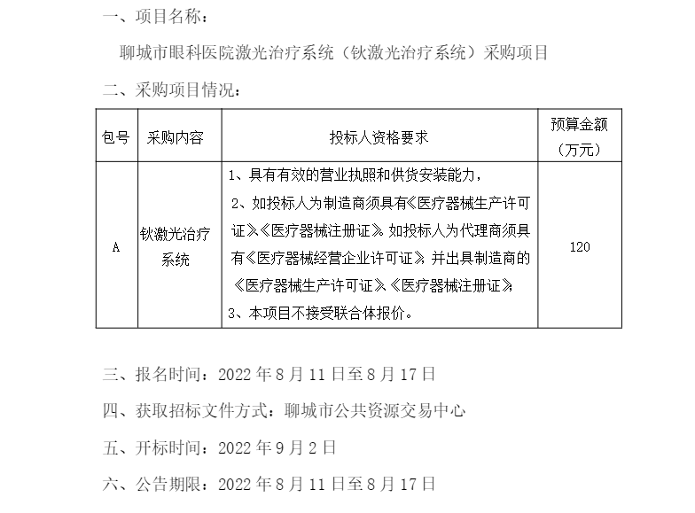 聊城市眼科医院激光治疗系统(钬激光治疗系统)采购项目招标公告
