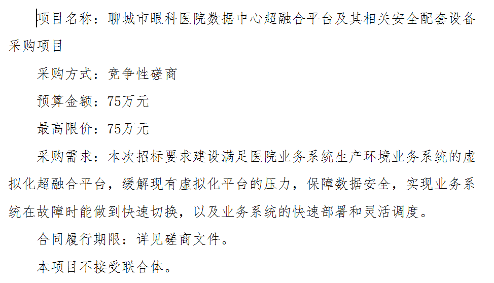 项目名称: 聊城市眼科医院数据中心超融合平台及其相关安全配套设备采购项目 二、采购项目情况: